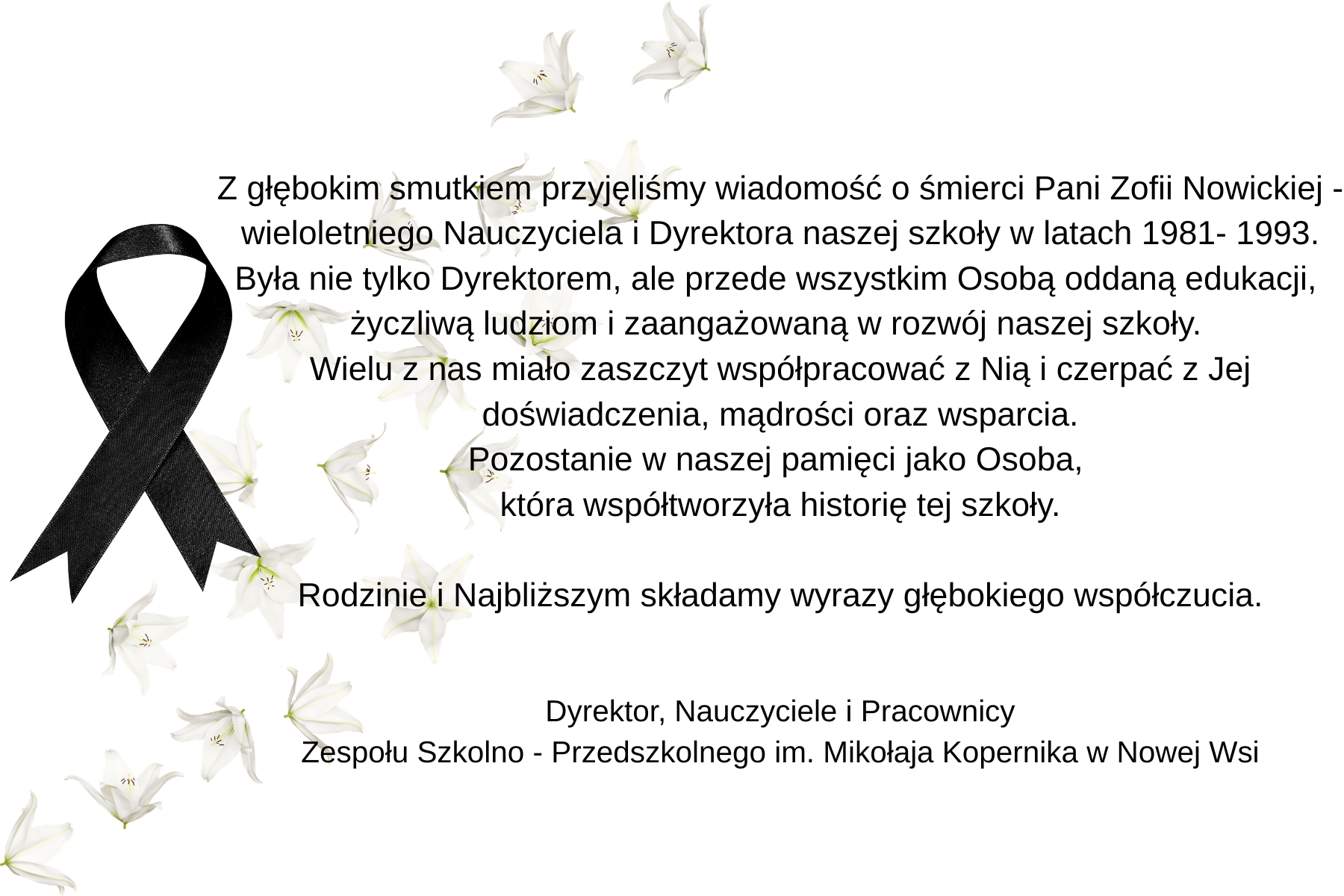 Z głębokim smutkiem przyjęliśmy wiadomość o śmierci Pani Zofii Nowickiej - wieloletniego Nauczyciela i Dyrektora naszej szkoły w latach 1981- 1993. Była nie tylko Dyrektorem, ale przede wszystkim Osobą oddaną edukacji, życzliwą ludziom i zaangażowaną w rozwój naszej szkoły. Wielu z nas miało zaszczyt współpracować z Nią i czerpać z Jej doświadczenia, mądrości oraz wsparcia.
